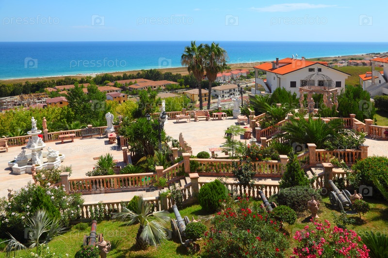 Ботанический сад со скульптурами, скамейками и пушками на балконе возле