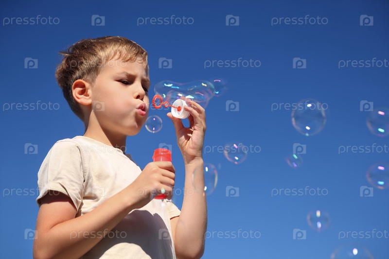 Ребенок вдыхает пузыри против чистого синего неба