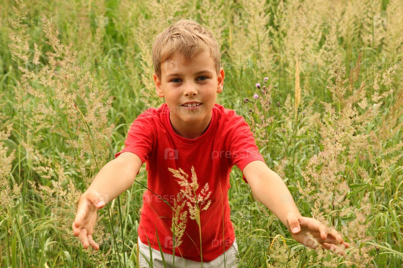 Маленький мальчик в красной рубашке стоит на высокой зеленой траве и касается лезвия