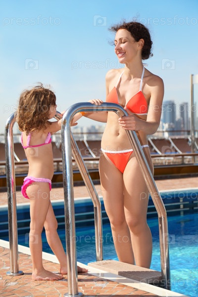 Красивая женщина стоит возле бассейна и смотрит на нее