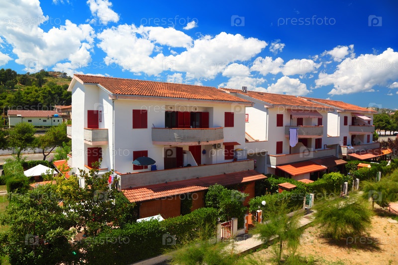 Три трехэтажных белых коттеджа с садом и террасами в холмистом месте