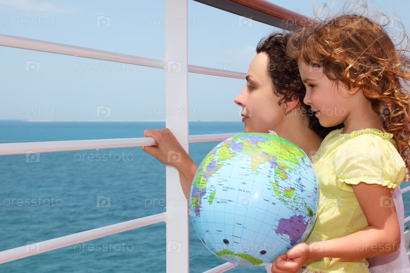 Мать и дочь на палубе круизного лайнера, ребенок держит надувную машину