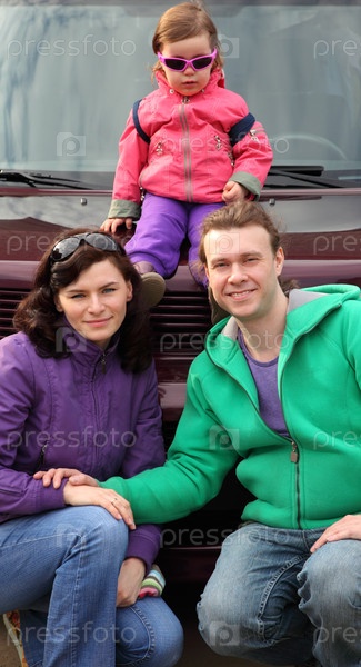 Счастливая семья в верхней одежде, мать и отец сидят перед машиной