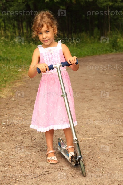 Красивая девочка в розовом платье ездит на скутере по природе. лес