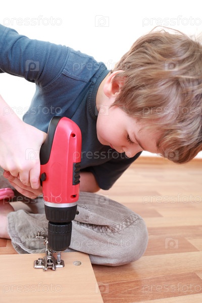 Ребенок использует красную дрель на деревянной поверхности