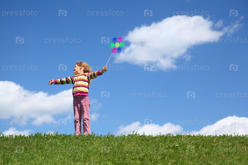 Девушка стоит на траве летом, смотрит в сторону и держит ветряную мельницу внутри