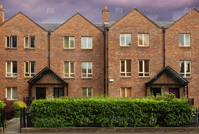 Небольшой трехэтажный дом стоит рядом с дорогой. окна, высокий зеленый
