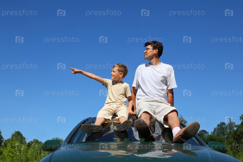 Отец с сыном сидят на крыше машины днем и смотрят в сторону