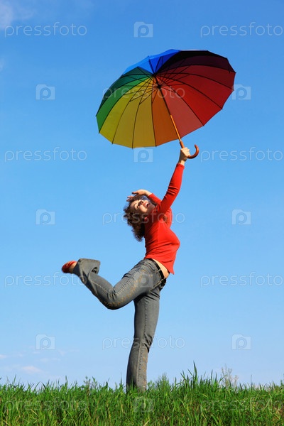 Девочка, стоящая на одной ноге на зеленой траве с красочными зонтиками в воздухе