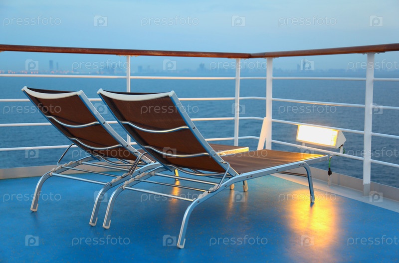 На борту корабля находятся два кресла с видом на город вечером и