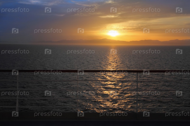 Красивый закат над водой. вид с палубы круизного лайнера. железная дорога в
