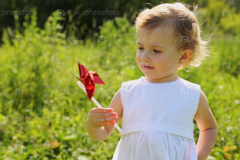 Маленькая девочка с красным штифтом стояла на траве и смотрела