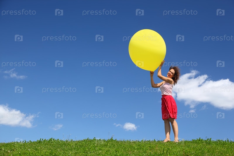 Девушка держит большой желтый воздушный шар на травянистом холме