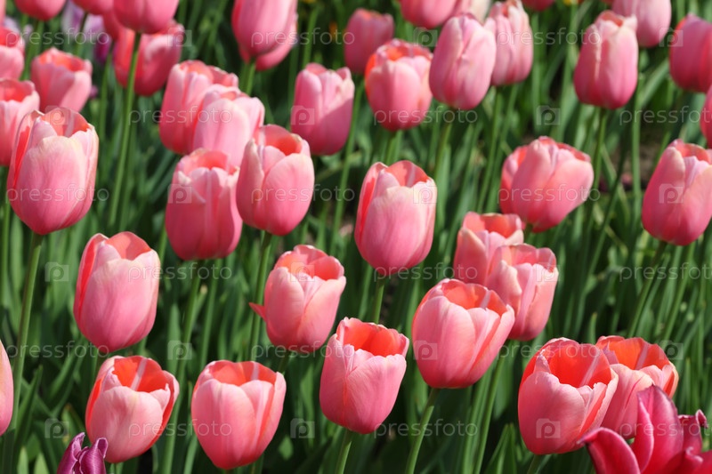 Розовые тюльпаны цветут в солнечной садовой кровать