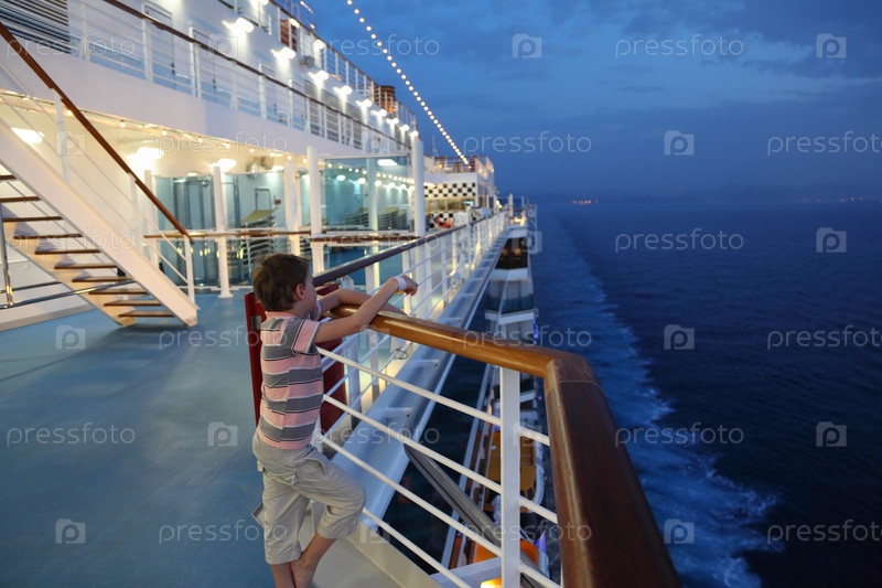 Маленький мальчик в шортах и полосатой рубашке стоит на палубе корабля