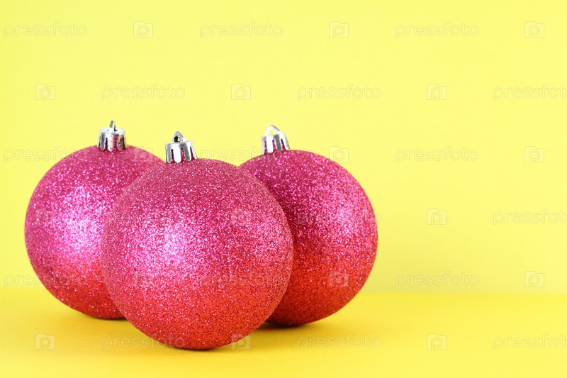 Три розовых блестящих рождественских орнамента на желтом фоне