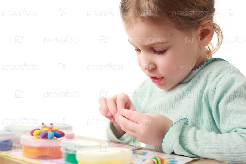 Боковой вид маленькой девочки, сидящей за столом и тщательно скульптурующей