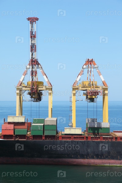 Большие желтые краны загружают контейнеры на грузовое судно