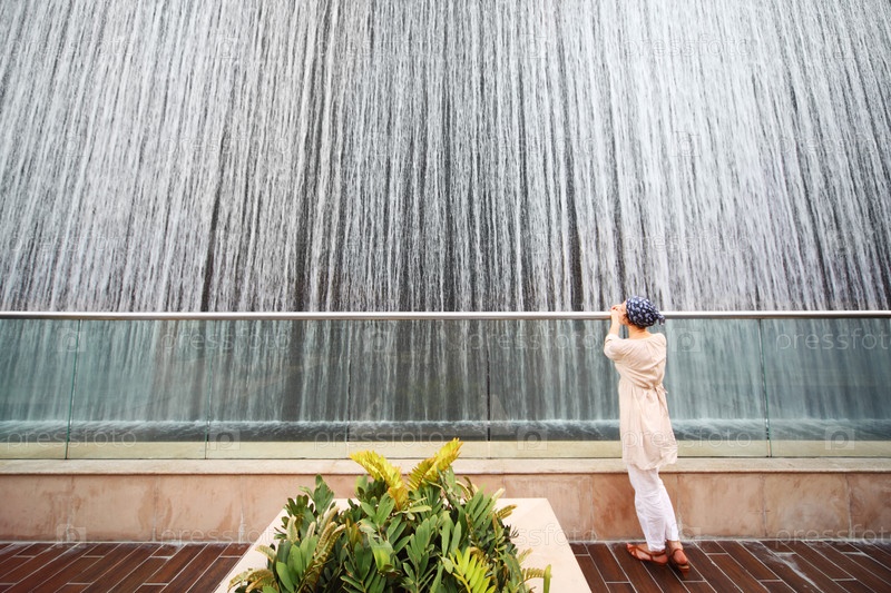 Молодая красавица в белой рубашке стоит возле большого фонтана, полная