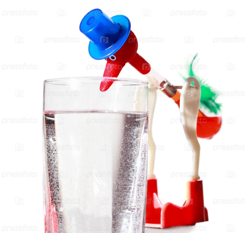 Красная мультфильмовая птица с синей шляпой глотает из стекла