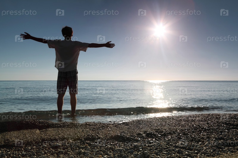 Силуэт стоит на берегу воды, руки широко раскрыты
