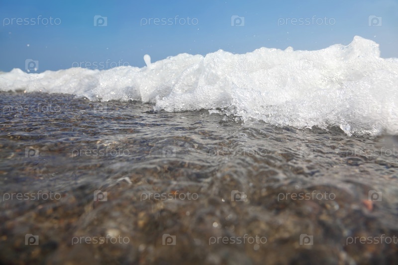 Чистое голубое небо над пенообразной океанской волной