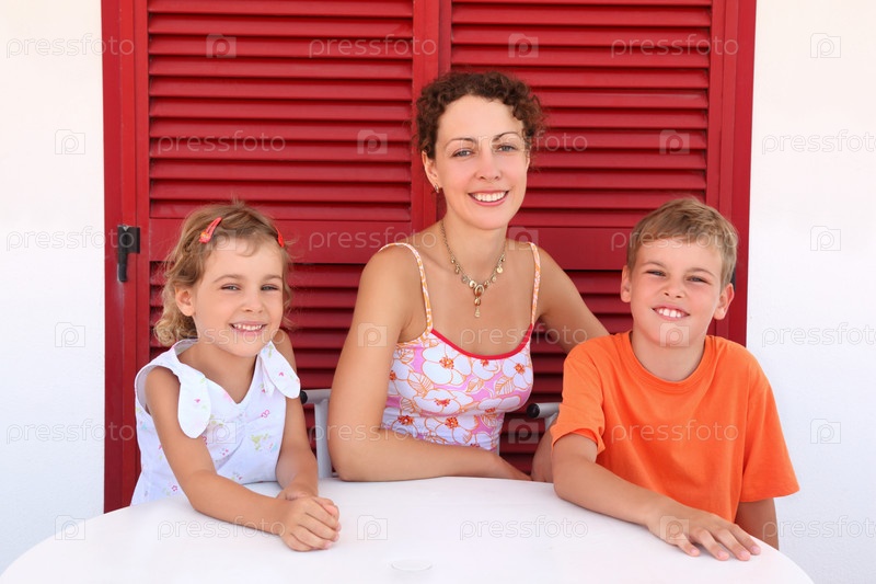 Мать с двумя детьми сидит возле закрытой двери за круглым столом и улыбается
