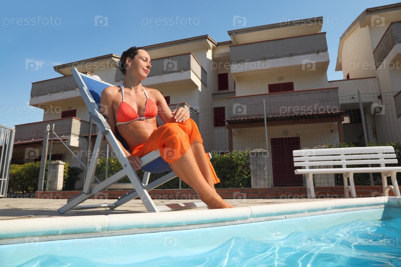 Молодая женщина в оранжевом бикини и парео сидит на пляжном кресле возле