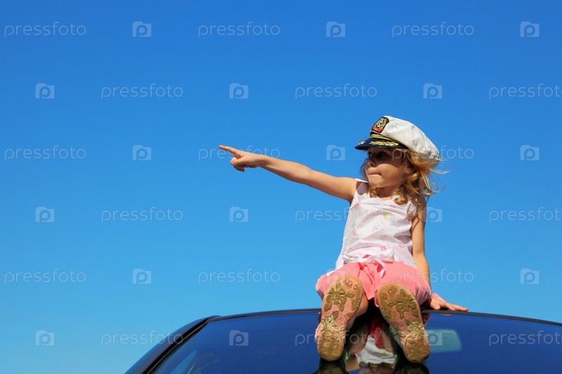 Маленькая девочка, сидящая на крыше автомобиля и показывающая пальцем с левой стороны, голубая