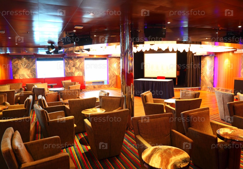 Интерьер кафе с сценой, креслами и столами на круизе