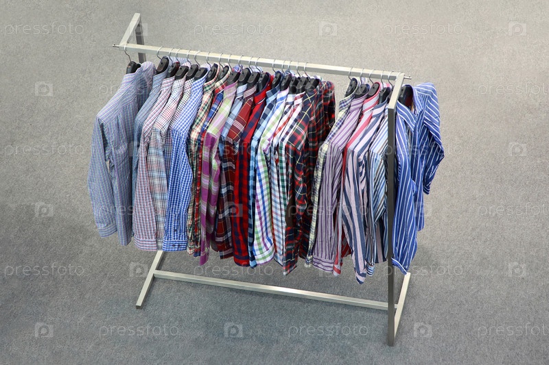 Дисплей рубашки аккуратно висит на металлической стойке