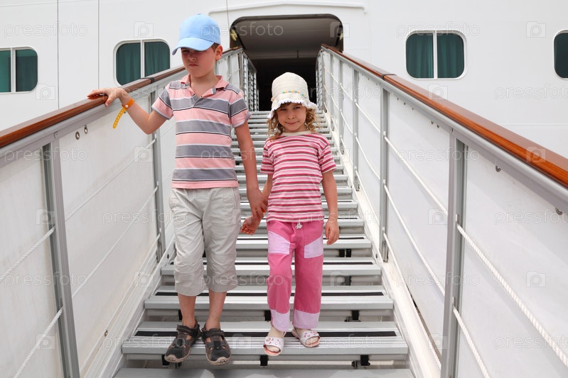 Маленький мальчик и девочка стоят на спутниковой лестнице на большой белой