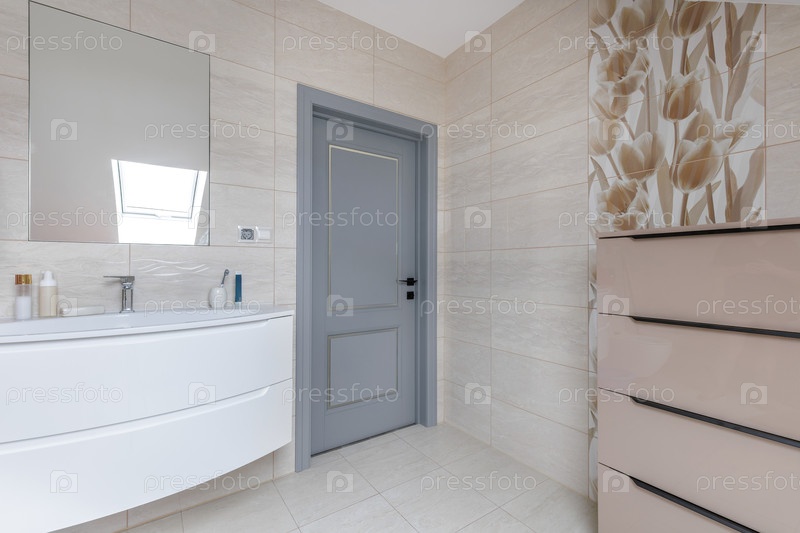 Интерьер яркой ванной комнаты с классической серой дверью с черной ручкой. включает в себя современное белое плавающее тщеславие с раковиной, квадратным зеркалом и бежевыми стеклянными плитками с декоративным цветочным рисунком тюльпанов. Профессиональная
