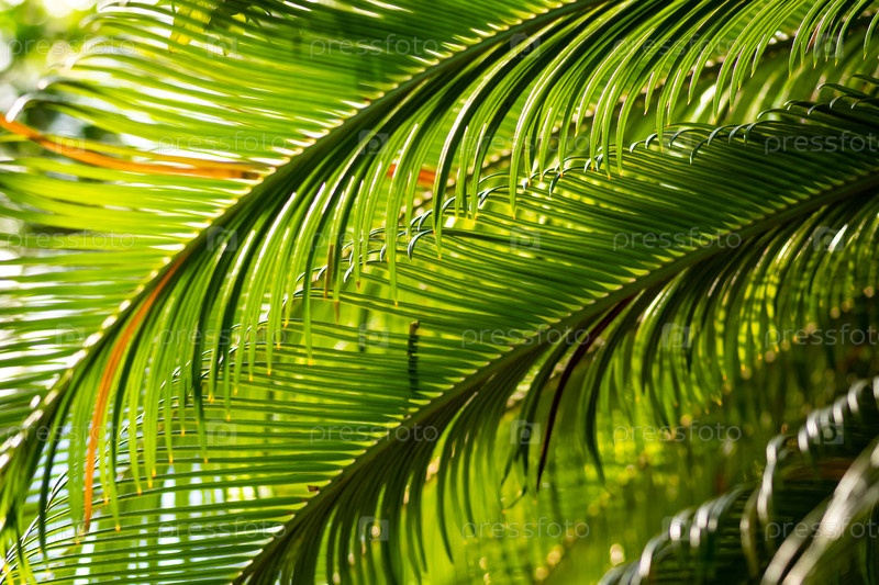 Крупный план ярко-зеленых листьев пальмы с солнечным светом, пробивающимся сквозь листву — тропический ботанический фон
