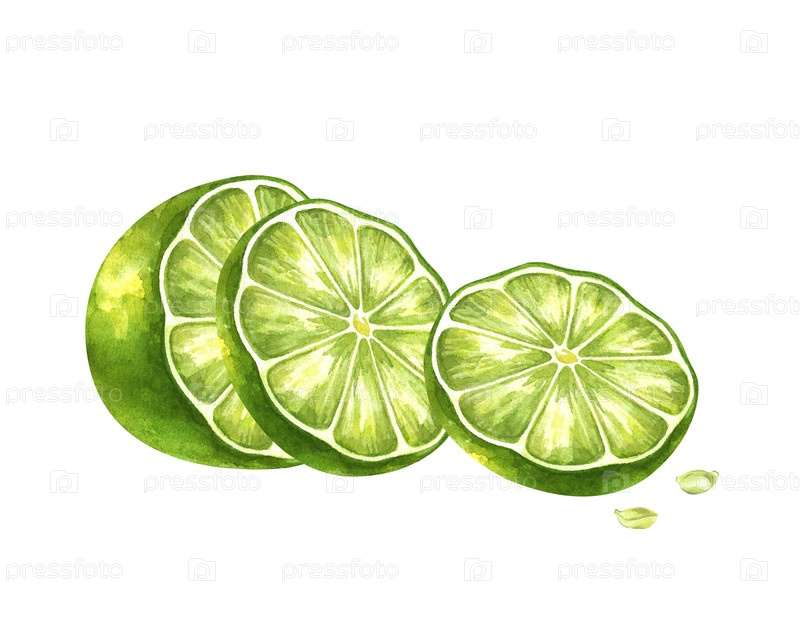 Свежие кусочки лайма с целыми фруктами и семенами, акварельная ручная иллюстрация изолирована на белом фоне
