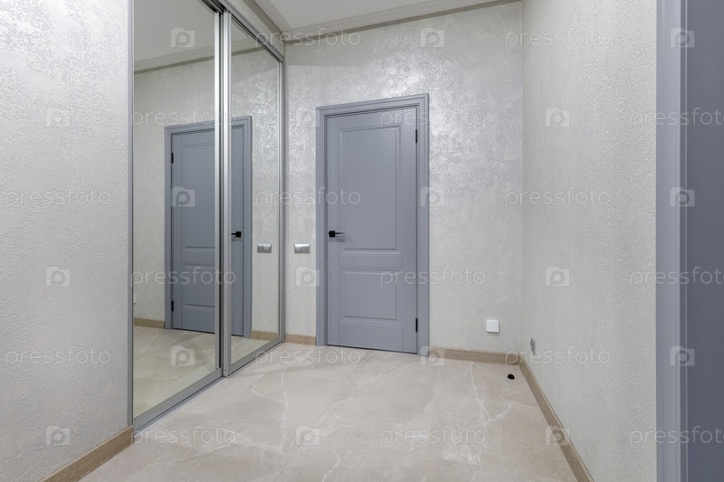 Яркий жилой коридор с большим встроенным раздвижным шкафчиком со зеркальными дверями.Интерьер включает классическую серую дверь с черной ручкой, светлые текстурированные стены и бежевые плитки из каменного пола.Чистая минималистическая архитектурная фотог