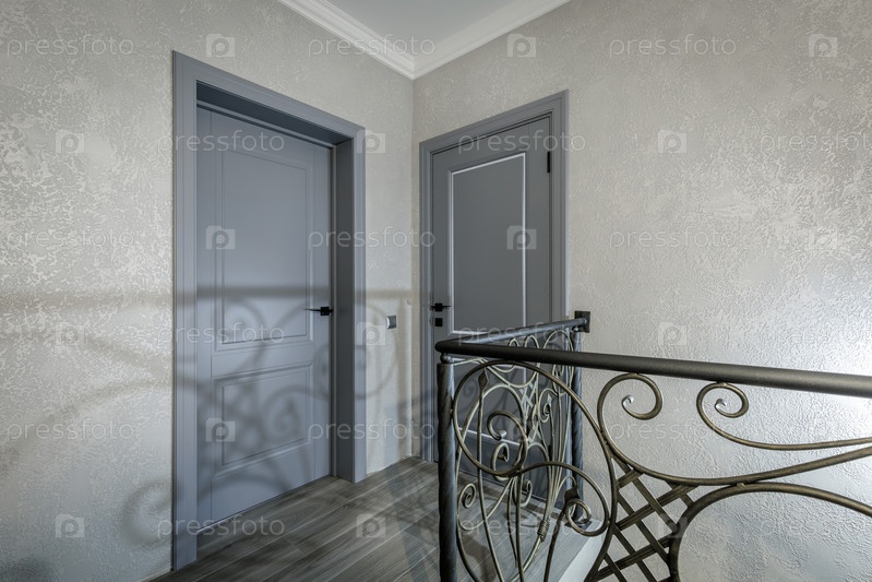 Внутренний вид яркого жилого коридора с двумя классическими серыми дверями с черными ручками. включает орнаментированные рельефы из кованого железа, создающие художественные тени на текстурированных гипсовых стенах. серое деревянное напольное покрытие и ч
