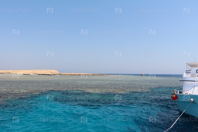 Лодка на кристально чистой бирюзовой воде возле тропического кораллового рифа
