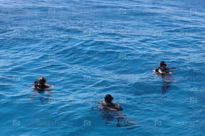Три человека, спускающиеся под воду в чистой синей воде океана