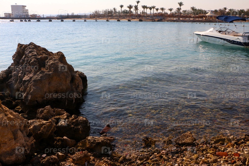 Скалистое побережье с чистым голубым морем, лодкой и отдаленным тропическим берегом