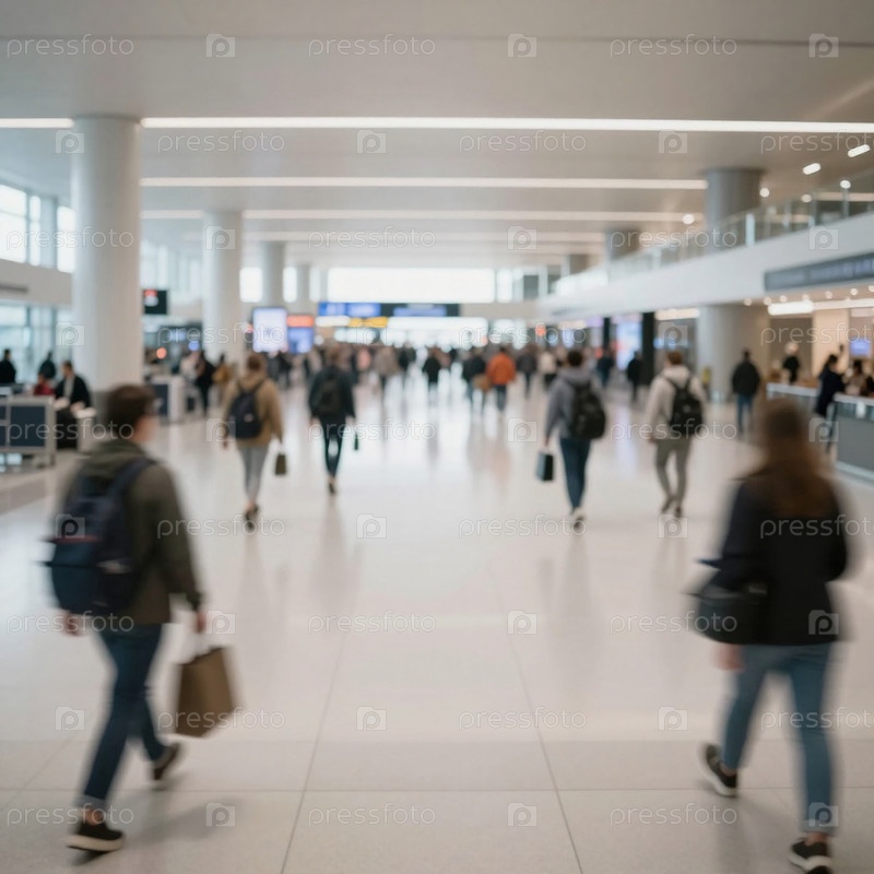 Многие люди перемещаются через оживленный терминал аэропорта.Путешественники несут чемоданы и спешат к своим воротам.Фон размыт видимыми вывесками и магазинами Generative AI