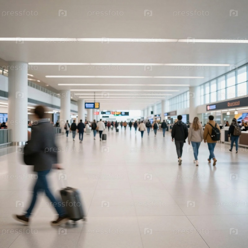 Многие пассажиры ходят по терминалу аэропорта, неся багаж.Люди занимаются различными видами деятельности, когда направляются к своим воротам под яркими огнями Генеративный ИИ