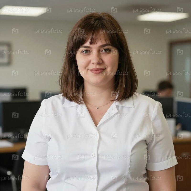Женщина с коричневыми волосами носит белую рубашку, стоя в офисе банка. Она имеет дружественное выражение лица и обращена к камере. Компьютерные станции видны на заднем плане Генеративный ИИ