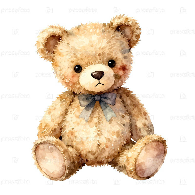 Медведь сидит на плоской поверхности. У него мягкое пушистое тело и голубой лук вокруг шеи