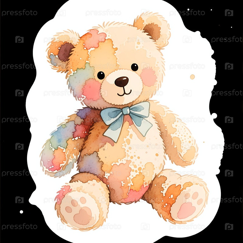 На простом фоне сидит плюшевый медведь с голубыми луками. Медведюшка имеет плацдармовый дизайн в различных цветах. Он выглядит мягким и привлекательным, захватывая очарование детства Generative AI