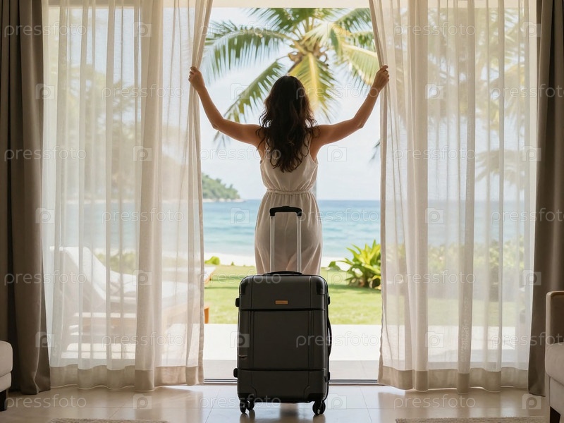 Женщина находится в гостиничном номере с чемоданом. она затягивает шторы, чтобы открыть пляж и пальмы снаружи. солнце светит ярко генеративный ИИ
