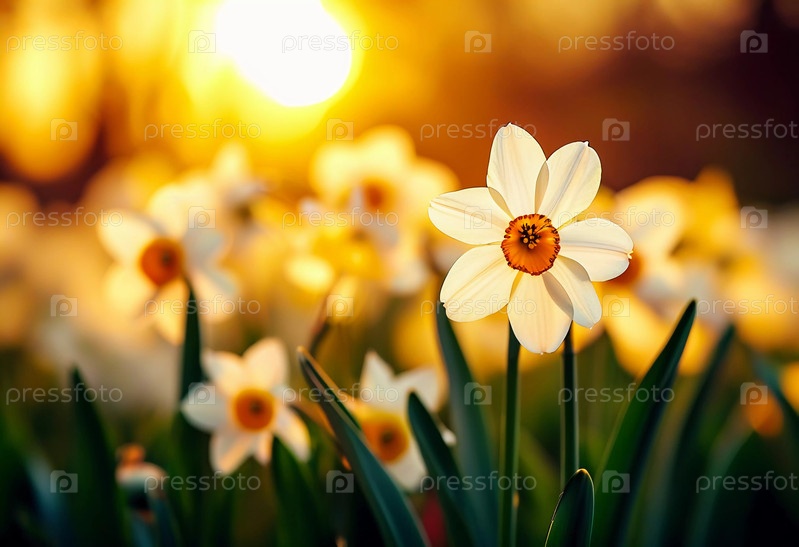 Цветы нарцисса растут в саду, когда заходит солнце. Солнечный свет создает мягкое свечение вокруг цветов. Сцена захватывает красоту природы в вечернем свете Generative AI