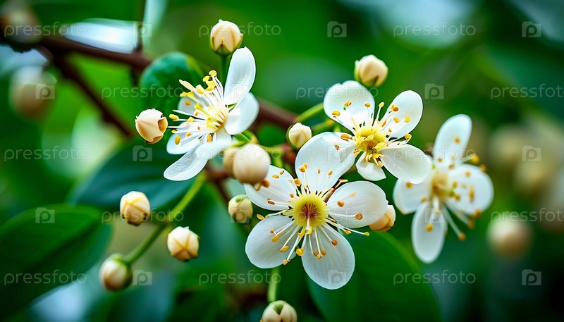 Цветы цветут в саду, наполненном зелеными листьями. Сцена показывает белые листочки и желтые центры. Бутоны готовы раскрыться в солнечном месте Generative AI