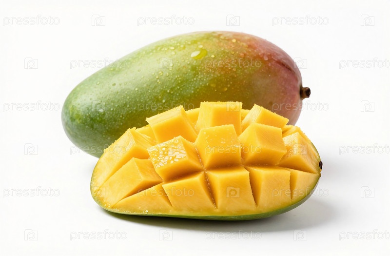 Два манго расположены на белом фоне.Один манго целый, в то время как другой разрезан и показывает свою желтую плоть в сетке.Капли воды видны на поверхности Генеративный AI
