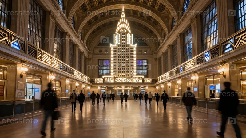 Группы людей перемещаются через большой железнодорожный вокзал.Сцена показывает размытые фигуры, когда путешественники проходят мимо освещенной архитектуры.Вечерний свет излучает теплое свечение Generative AI